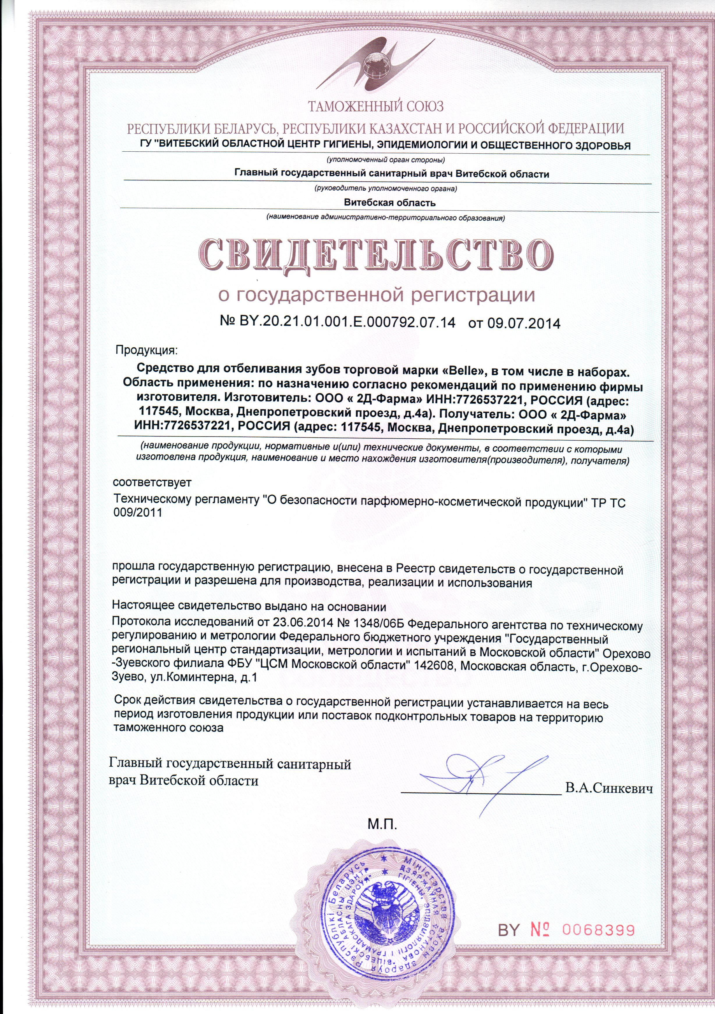 Свидетельство о государственной регистрации средств отбеливания зубов Belle